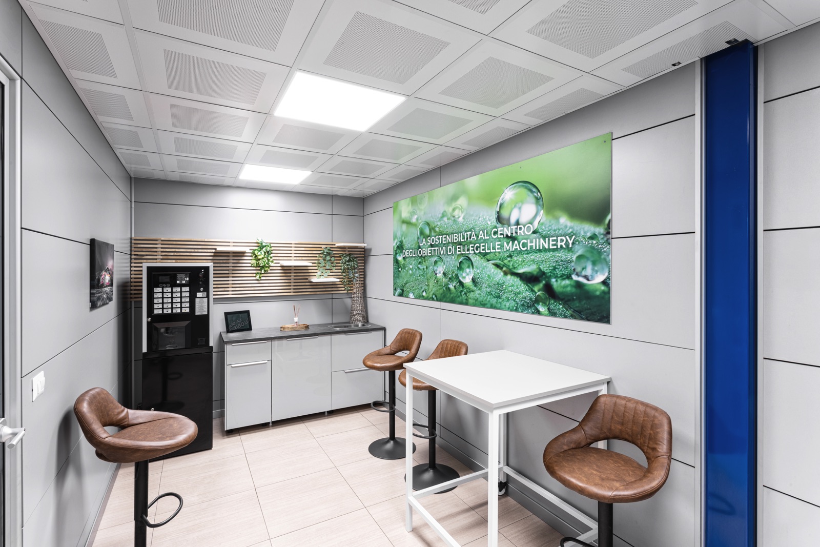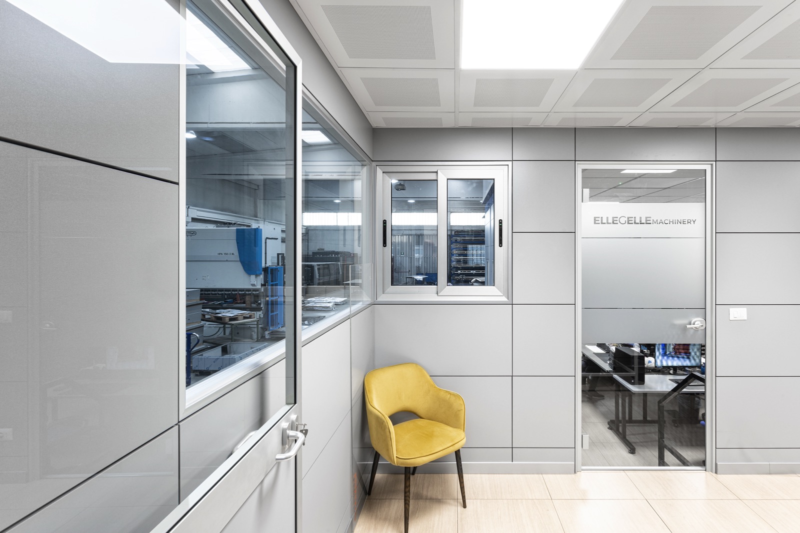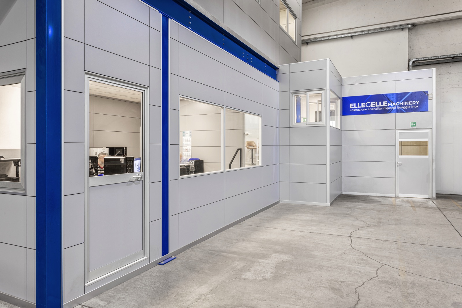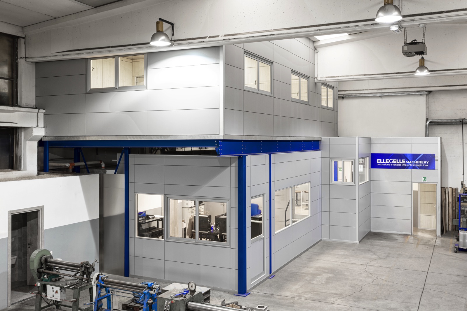 Le immagini mostrano la zona uffici costruita sul soppalco, gli spazi operativi su due livelli e l’organizzazione razionale degli ambienti, progettati per ottimizzare la funzionalità e la superficie disponibile.