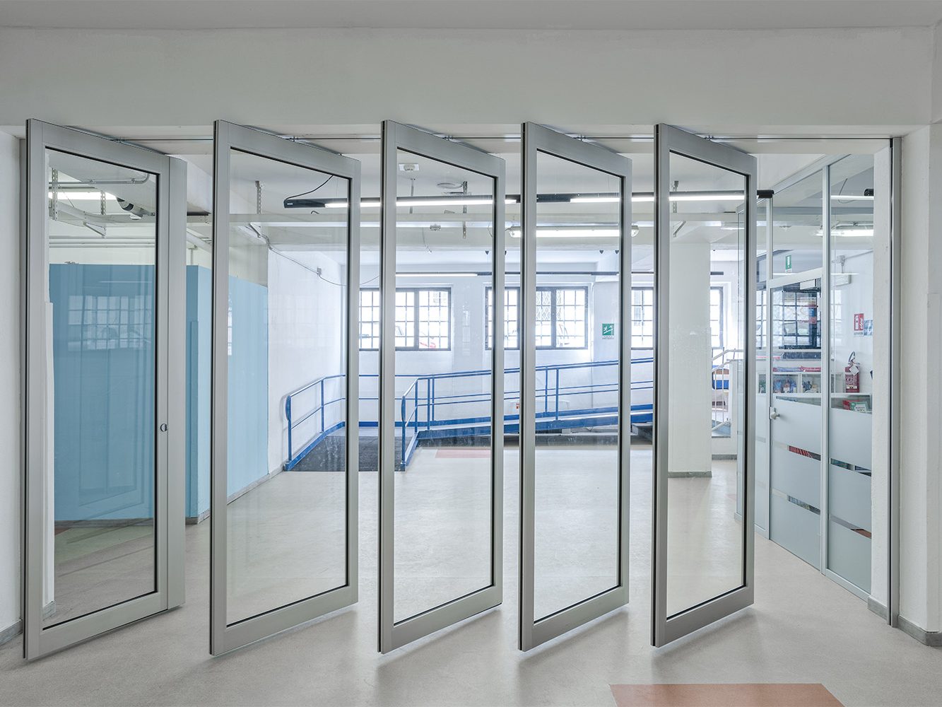 La personalizzazione delle pareti divisorie vetrate con l’inserimento di pannelli colorati è stata una scelta del cliente per contribuire a dare all’ambiente un aspetto giovane e stimolante.