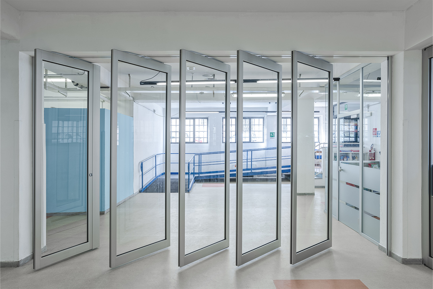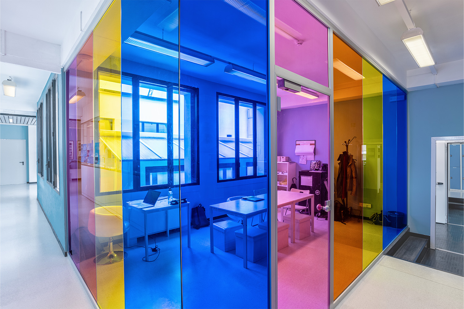 La personalizzazione delle pareti divisorie vetrate con l’inserimento di pannelli colorati è stata una scelta del cliente per contribuire a dare all’ambiente un aspetto giovane e stimolante.