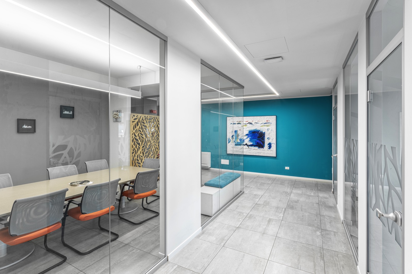 Illuminazione Integrata: Abbiamo installato un sistema di illuminazione a LED integrato nelle pareti divisorie, migliorando l’efficienza energetica e garantendo un’illuminazione uniforme e confortevole.