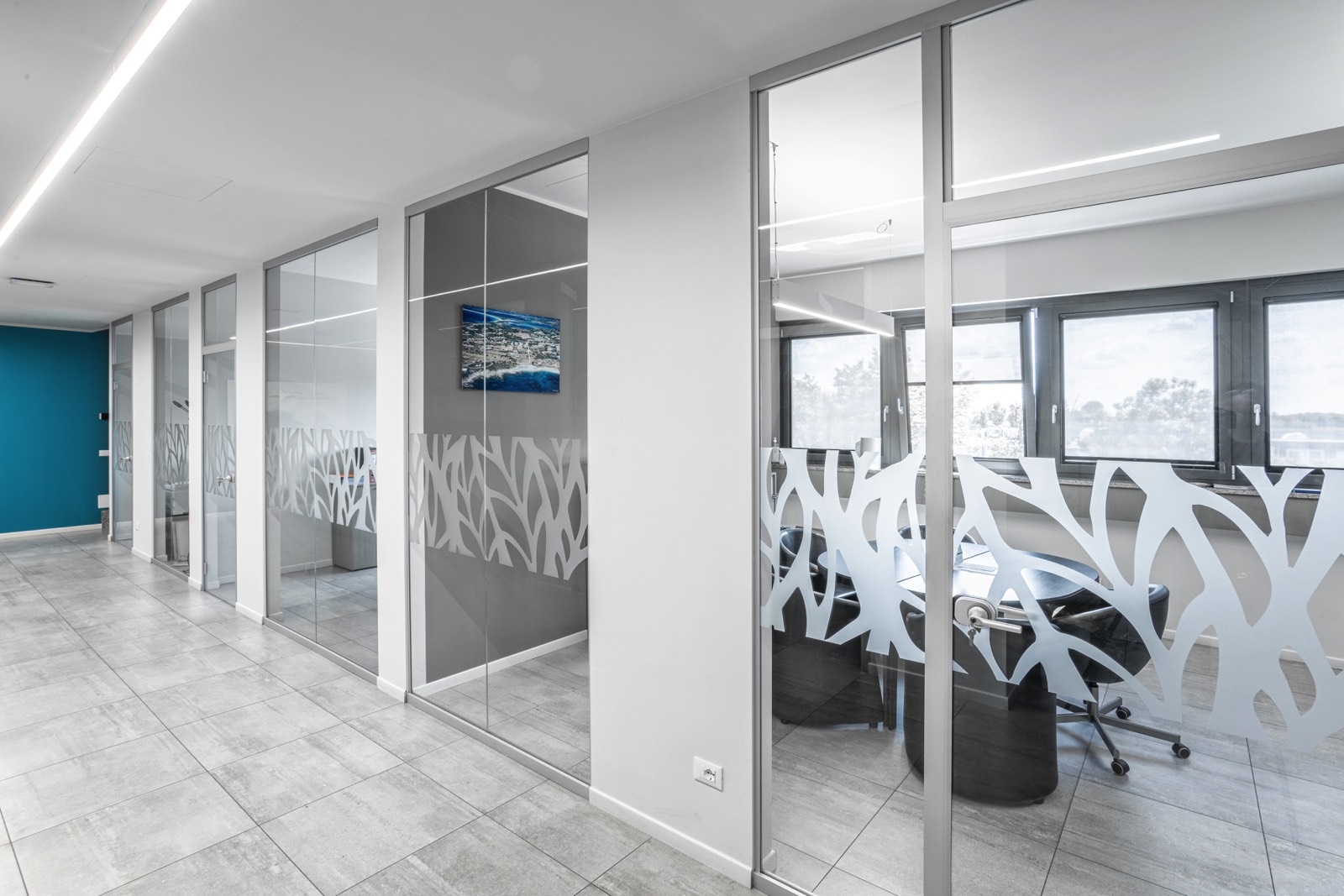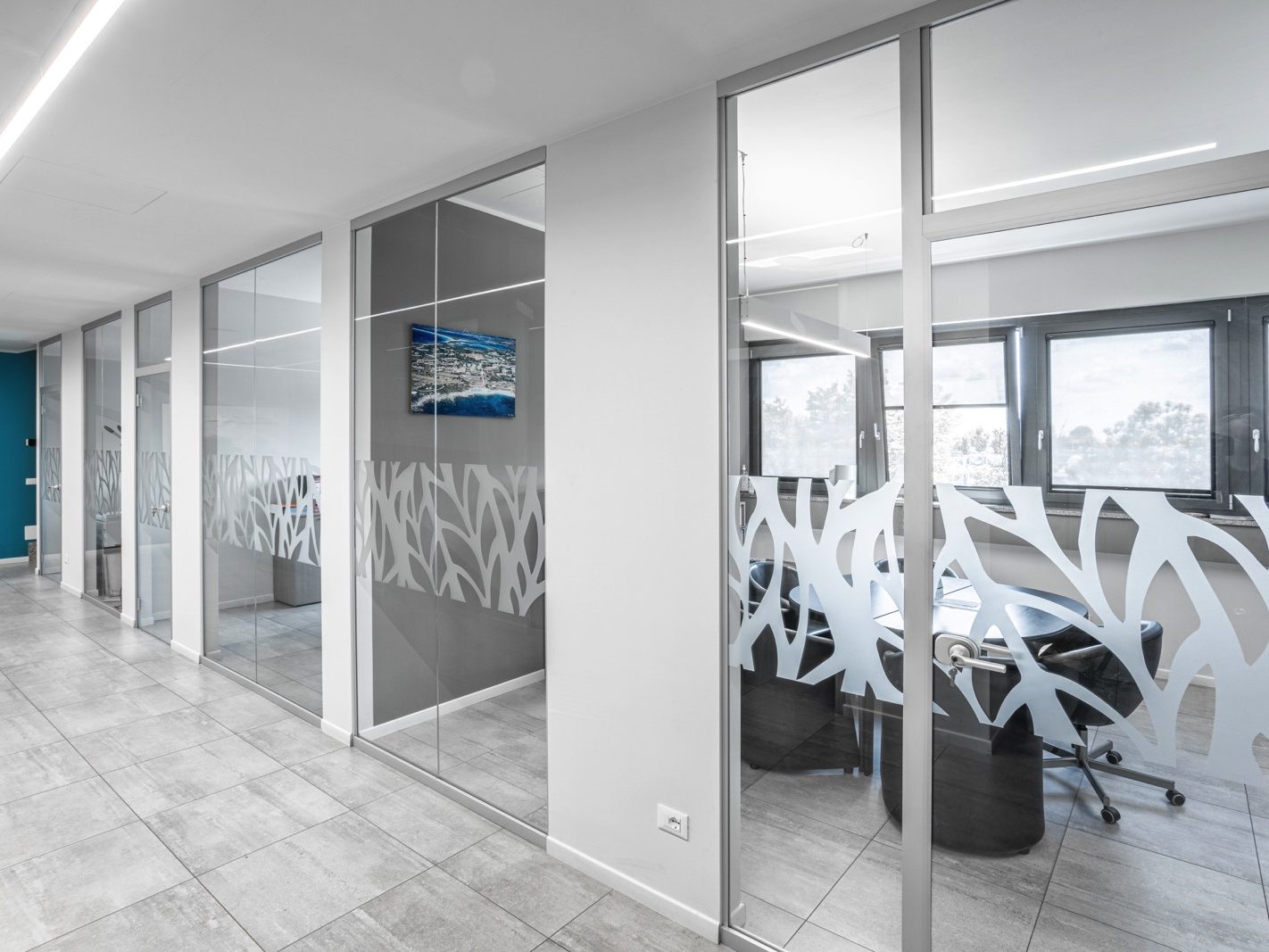 Pareti Divisorie in Vetro: Installate per creare uffici privati e sale riunioni, consentendo la massima trasparenza e luce naturale. Le pareti sono decorate con pellicole adesive dal design moderno, per garantire la privacy mantenendo un aspetto estetico accattivante.