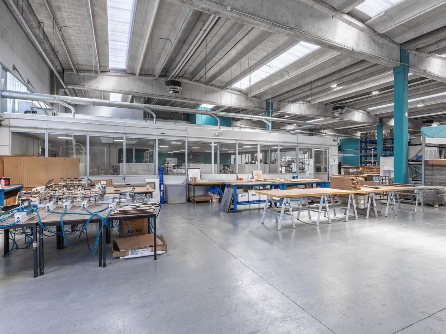 Pannelli Modulari: Utilizzati nelle aree di produzione per separare le diverse zone operative senza compromettere lo spazio. I pannelli sono stati scelti per la loro resistenza e facilità di manutenzione.