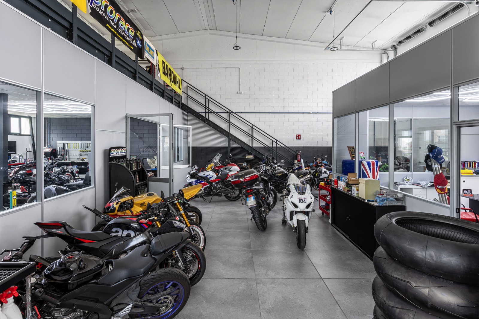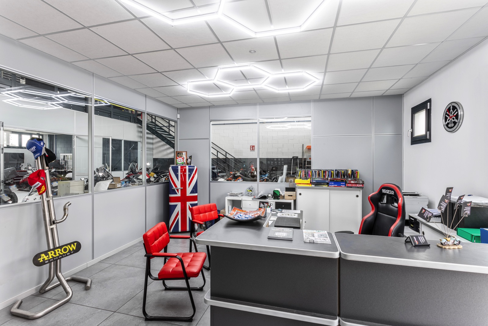 Le immagini mostrano il nuovo punto vendita organizzato in tre aree distinte: esposizione moto, accoglienza clienti e officina. Le pareti divisorie con elementi vetrati creano continuità visiva e trasparenza, valorizzando gli spazi e l’illuminazione naturale.